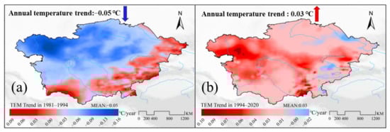 (a,b) Temporal and spatial trends of temperature before and after 1994, respectively.