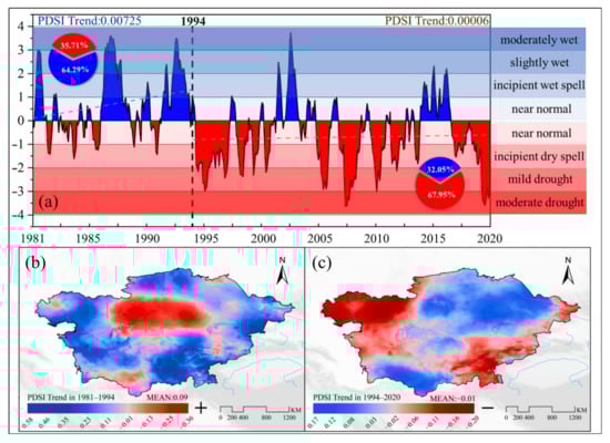 Dynamic characteristics and temporal and spatial trends of PDSI in Central Asia: (a) monthly average dry and wet shade anomalies of PDSI from 1981 to 2020; (b,c) PDSI trends before and after 1994, respectively.