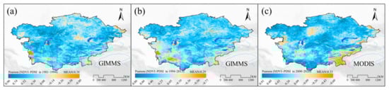 Spatial variation trends for NDVI: (a,b) the GIMMS NDVI trends before and after 1994, respectively; (c) the MODIS NDVI trends from 2000 to 2020.