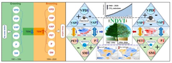 Analytical diagram of NDVI spatiotemporal variation mechanism. The graph showing CO2 emissions presents the monthly mean carbon dioxide measured at the Mauna Loa Observatory, Hawaii, USA, from the Scripps Institution of Oceanography NOAA Global Monitoring Laboratory (https://gml.noaa.gov/ccgg/trends/mlo.html, accessed on 20 April 2022).