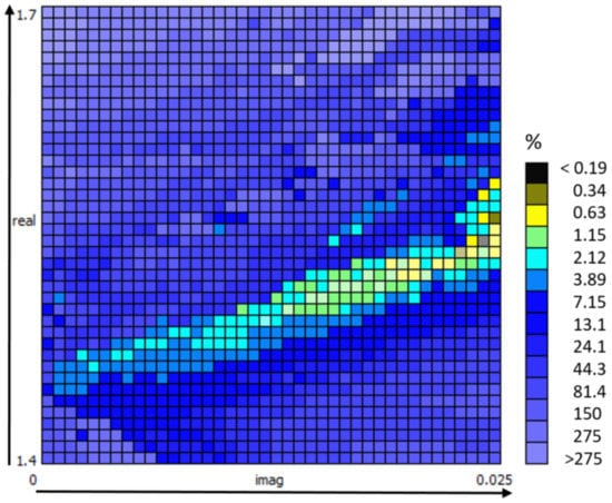 Since the CRI is also an unknown variable, the software deals with a RI grid of possible real and imaginary parts of the CRI; see Figure 1. The potential candidates of appropriate CRI are quite often located in a diagonal pattern, which is an indication of good optical data quality. Moreover, this means that the CRI is not uniquely for retrieval. We only obtain a mean value of the CRI. Figure 1 shows an example of which points on the diagonal were selected. Roughly speaking, a cluster of physically meaningful grid points, which delivers a similar shape of the PVSD, was selected. It is worth mentioning that the shape retrieval of the PVSD was without any restrictions to the number of modes and the shape of the curve, as is done in [28] with a known refractive index as input.
