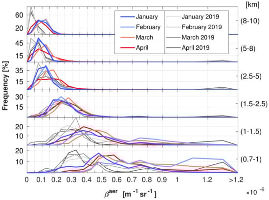 To present an overview, frequency polygons of the measured backscatter coefficients at 532 nm (for brevity) for different months and heights are plotted in Figure 2. The altitude ranges were chosen in such a way that they represent the atmosphere as best as is possible, meaning that there are only small changes within each range. The histogram classes become wider for larger values and are represented by the grid. For better comparison, previously published values for January–March 2019 are also shown in grey [29]. In the lowest troposphere up to m, there were much higher backscatter values in 2020 than in 2019. The mechanical boundary layer (MBL) is usually located at this altitude, which is described in more detail in Section 4.2. In the undisturbed troposphere, the values are very similar in both years, with slightly increased values in 2020 in the highest troposphere above km. This is caused by a higher aerosol concentration in the stratosphere due to wildfire smoke [6].