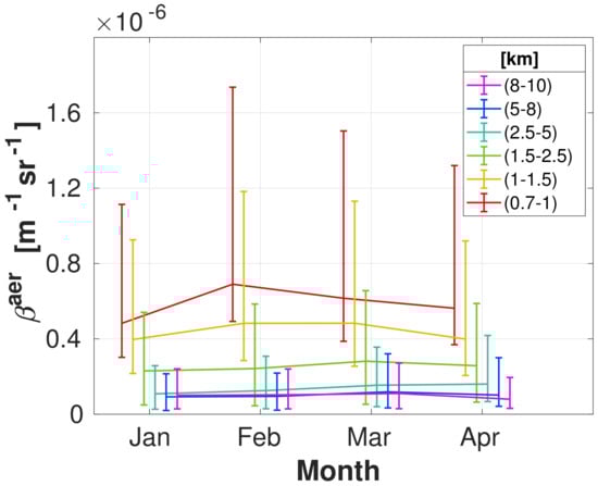In Figure 3, the temporal evolution of the backscatter coefficients is shown for the different altitude ranges. The solid line represents the median value and the error bar is the 25th and 75th percentiles as an indicator of the distribution width. The median was used since it is more stable regarding outliers and events with strong increased backscatter. Therefore, it gives a better overview of the measured values than the mean does. As expected, the backscatter decreases with height, and higher values also show increased variability. As the backscatter coefficients can physically only be positive, the 75th percentile always differs more from the median than the 25th percentile. It can be seen that the maximum of , which we call Arctic haze, occurs in February at (0.7–1) km, while this shifts to March or even April in the upper troposphere. Usually, it is expected that Arctic haze is mainly caused by a higher amount of continental aerosol, meaning a high lidar ratio [30]. Due to the strong noise when evaluating the extinction in lidar, we only considered the LR up to km in the same altitude ranges as before. The median values and percentiles are presented in Table 1 separately for all high backscatter events ( larger than median) and all low backscatter events ( smaller than median).