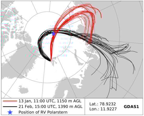 Five-day backward trajectories calculated with HYSPLIT [31,32]. The initial position is the location of the lidar in Ny-Ålesund at the altitude of the sampled aerosol layer. The position of RV Polarstern at 12 January, 2020, 06:00 UTC is also marked [33].