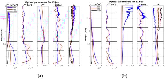 For an overview of the lidar parameters, we show the measured optical parameters as altitude profiles in Figure 5a,b. The aerosol backscatter coefficients, extinction coefficients, the depolarization, lidar ratio and Ångström exponent are shown. The data is shown for 13 January (10:21–12:14) UT and 21 February (13:40–15:10) UT. In the figures, the time averaged profiles are presented. The altitude intervals for which the microphysical aerosol properties have been derived are marked with black lines.