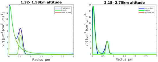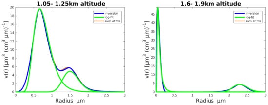 Volume distribution function of the particle radius r for two different altitudes on 21 February, one within the MBL and one above. Blue: result of the inversion; green: log-normal fits. If the sum of the fits (in red) cannot be seen, it is congruent with the inversion. All values are given in Table 3. The mode with the smaller radius is referred to as the first mode.