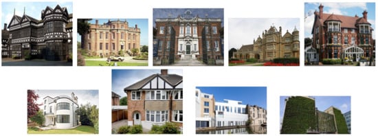 Examples of architectural styles in United Kingdom. Top row from left: Tudor, Baroque, Georgian, Victorian and Edwardian; bottom row from left: Art Deco, 1930s, Modern (white-grey building) and Green ‘Living Wall’. The images were taken from multiple modalities: Modern: https://architizer.com/blog/inspiration/collections/architecture-on-the-market-london-contemporary-homes/, accessed on 17 January 2022, Living Wall: https://tugc.co.uk/portfolio-item/maintaining-one-of-the-biggest-living-walls-in-london/, accessed on 17 January 2022, Others: https://www.bohaglass.co.uk/british-architectural-styles/, accessed on 17 January 2022.