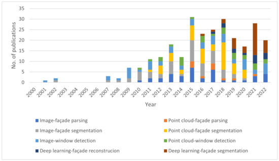 The increased technological development in data collection and associated processing methods has impacted the scientific community, as reflected in the increase in the number of journal articles, books and series on facade-related studies (Figure 3). The origins of research related to façade reconstruction involved the processing and analysing of images. About a decade later, in 2011, the possibilities of point clouds for building reconstruction began to be explored. The year 2016 represents the advent of research introducing deep-learning methods, which, in 2021, comprised about two-thirds of publications on the use of deep learning in façade opening extraction-related topics. To order the content of the collated literature into a manageable taxonomy, a set of themes and questions was developed to guide this review (Table 1).