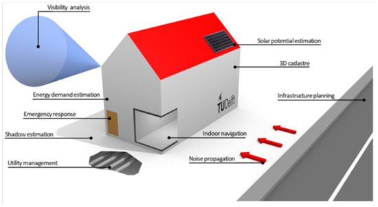 Therefore, 3D city models play an essential role when analysing and managing urban data, and this is evidenced by the large number of applications that utilise this information [2]. The integration of 3D city models with non-geometrical data, such as social, economic, acoustic or historical information has proven its utility in fields including 3D cadastre [3], emergency response [4], decision-making, urban planning [5], smart cities [6] and more recently, in the digital twin field where 3D city models serve as a fundamental source of information [7].