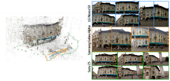 The GNSS sensor allows for a relatively accurate determination of the position of the camera when taking an image, depending on the quality of the signal and the sensor [66]. The potential use of images acquired from mobile phones for building modelling has been investigated in several studies [67,68,69]. In these, phone images were used to create point clouds of buildings through the structure from motion (SfM) [70] algorithm. The presented results demonstrated that data acquired from mobile phones by multiple users could be successfully combined to derive a 3D point cloud [67] (Figure 8).
