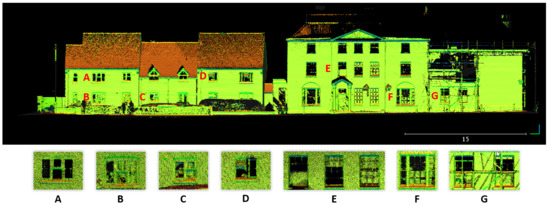Mobile mapping system point cloud representing a building façade. (A)—window represented by holes without noise. (B–G)—samples of windows with varying degrees of obscuring. Source: OS © Crown copyright and database rights 2022 OS.