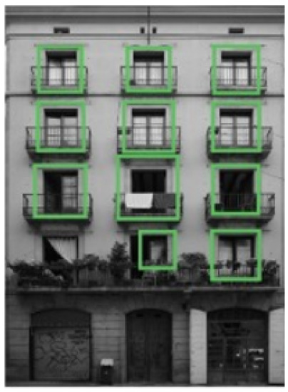 - Neuhausen, M.; Martin, A.; Obel, M.; Mark, P.; König, M. A cascaded classifier approach to window detection in facade images. In Proceedings of the 34th International Symposium on Automation and Robotics in Construction, Taipei, Taiwan, 28 June–1 July 2017. [Google Scholar] [CrossRef] [Green Version]