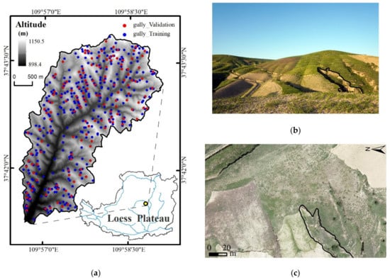 Study area. (a) Altitude surface of the study area based on UAV-sourced DSM and locations of watershed and gullies sampled. (b) Photo of a typical gully. (c) Typical gully in UAV-sourced DOM.