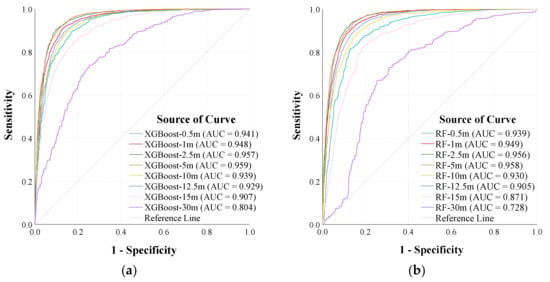 Validation of the ROC curve at each resolution. (a) XGBoost. (b) RF.