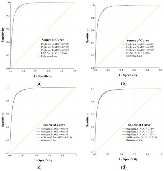To verify the robustness of the models, we randomly selected three different samples from the training and testing sets to evaluate the prediction accuracy at a resolution of 2.5–5 m (Figure 6). The results showed that the maximum difference of the AUC in different random samples was less than 0.04. Thus, the two models exhibit good stability for three random samples, and the results are similar.