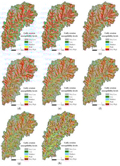 Gully erosion is one of the most severe types of soil erosion [,] and is a threat to the environment and society []. It affects nearly 1 billion hectares of land worldwide [], and its soil loss rate accounts for 10–94% of the total sediment production caused by water erosion []. The gully erosion susceptibility (GES) map is a valuable tool for discovering potential gully-prone areas and, thus, for helping to control gully erosion [,]. The selection of resolution affects the accuracy of the modeling results, making the selection of the optimal resolution one of the major challenges in GES mapping.