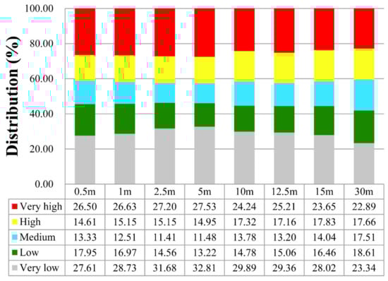 Figure 8 quantitatively shows the percentages of susceptibility classes at each resolution. The percentages of both the very high- and high-susceptibility classes did not change much with a resolution ranging from 0.5 to 5 m. The model at this resolution is consistent with gully simulation, and the area is seriously affected by gully erosion. The very low-susceptibility class was more affected by the resolution. At fine resolution (0.5–1 m), the percentage of this class was low, and more areas were predicted to be low- and medium-susceptibility classes. When the resolution became coarser, from 5 m to 30 m, generally speaking, the percentages of the very low- and very high-susceptibility classes both decreased, and more areas were predicted to be moderately susceptible. This result indicates that, as the resolution becomes coarser, the ability of the model to distinguish between gully and non-gully areas decreases.