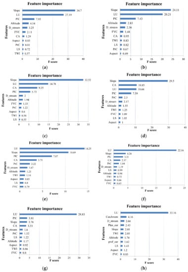 The variable importance results showed that slope gradient, LU, and contributing area were the most critical factors related to the occurrence of gully erosion, which is a common geomorphological process. Most of the gullies in the study area are located in the middle of hillslopes. The hillside process mainly controls the formation and development of these landforms []. Flow velocity and discharge are the main factors that determine the amount of slope erosion []. There is a significant runoff in the middle part of the hillslopes on the Loess Plateau, and the hillslopes are steep. The energy of the slope flow and the undercutting ability of surface runoff are considerable. When the shear force of the slope surpasses the critical condition for gully development, the slope may be destroyed and gradually develop into a gully []. The slope gradient controls the flow velocity of the runoff, and the contributing area provides essential storage for surface runoff []; thus, the slope gradient and contributing area play important roles in the formation and development of gullies. Land use is closely related to hydrological and geomorphological processes which control the dynamics of surface runoff and sediments and impact slope stability []. This is considered to be a critical driving factor affecting land degradation and gully formation []; some studies have also proved that it is an important factor affecting gully erosion occurrences [,].