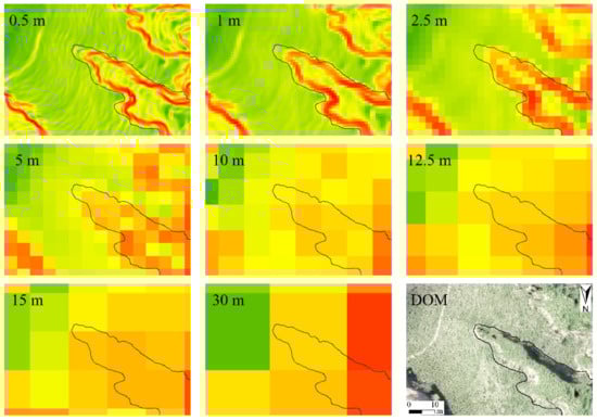 We used a UAV to obtain digital surface models (DSMs) and digital orthophoto maps (DOMs) of the studied watershed in August 2019 at a spatial resolution of 9 cm. The type of UAV used was a DJI4RTK, and control points were evenly distributed in the study area to reduce the position offset error and increase the accuracy of data []. The flying altitude of the UAV was 300 m, and the side overlap and front overlap were both more than 70%. The weather conditions were good, with a clear, partly cloudy sky. The Pix4D mapper software was used for data processing. Firstly, the acquired image was matched and calibrated. Then, point clouds were generated from the calibrated image to create the 3D mesh, and a 3D model was built using the SfM method to generate a DOM and DSM. Based on the DSM, a series of DEMs with various resolutions (0.5, 1, 2.5, 5, 10, 12.5, 15, and 30 m) was obtained.