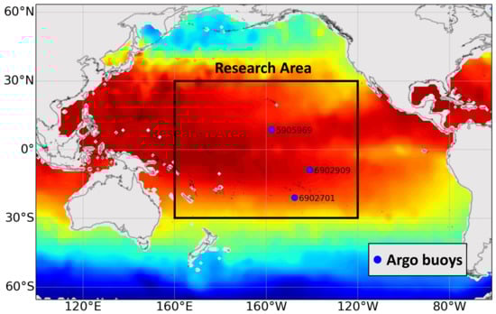 In order to validate the inversion method proposed in this study, the region shown in Figure 1 was chosen as the study area, which is located in the central Pacific Ocean (30°S–30°N, 160°E–120°W) and has a vast sea area with a significant temperature difference. There are several oceanic current zones, such as warm equatorial current and the equatorial countercurrent, with the typical sea-air interaction phenomenon ENSO (El Niño-Southern Oscillation). The study of this region could effectively verify the proposed inversion method of oceanic elements.