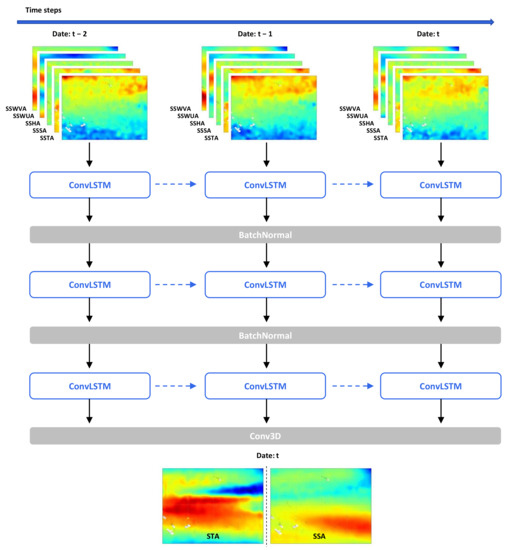 The convolutional long short-term memory network (ConvLSTM) algorithm proposed by [53] further takes into account the spatial information in the time series and can combine the temporal and spatial characteristics of the data. The authors of [44] applied this method to atmospheric wind field forecasting and obtained accurate, large-scale predictions. This method can also invert the subsurface parameters of other ocean variables (e.g., currents, eddies) by combining multiple sea surface factors.
