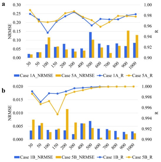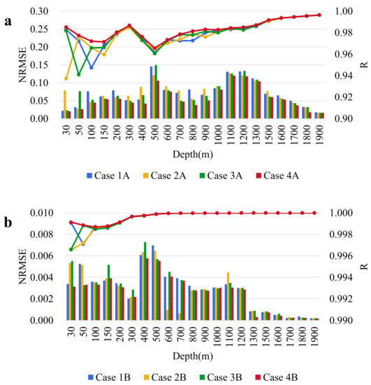 For the comparison of SS inversions, the comparison results of different experiments are shown in Figure 3b. Overall, R continues to rise after a brief decline, and NRMSE shows an increasing trend from 0 to 150 m, followed by a brief decline, reaching a maximum error at 400 m. NRMSE also gradually decreases with increasing depth. The averages of NRMSE and R for salinity inversion at all depths are 0.0028/0.0026/0.0029/0.0025 and 0.9996/0.9995/0.9996/0.9997. Unlike the previous ST experiments, the effect of each channel during the salinity inversion experiment is not apparent. The smallest average NRMSE is Case 4B, only 0.0004 less than the largest Case 3B. The above results indicate that the application of multiple channels in the salinity inversion task has played a specific effect. All the comparison results have more obvious differences within 100 m. The data of Case 4B almost achieve the best case in 0–100 m, which indicates that the multi-channel data still have a more significant impact in shallow waters.