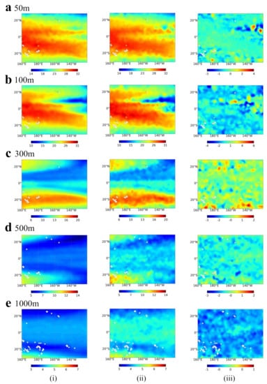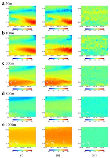 Figure 4 and Figure 5 present a comparison of ST and SS for different depths (50, 100, 300, 500, and 1000 m) of the ConvLSTM model inversion (i) and Argo labels (ii) for one particular time snapshot (March 2018). The error (iii) is the absolute error of the Argo data subtracted from the inversion data. From the perspective of spatial distribution, model inversion results are consistent with the distribution of the Argo grid. As the depth increases, the absolute error of the model decreases, but the similarity between the inversion results and the truth data decreases. This may be due to the spatial and temporal correlation information of the ocean surface being gradually confounded by complex internal ocean processes, but the model lacks sufficient data to learn such processes. As shown in Figure 4, the retrieval R values of the five different depth ranges were 0.9860, 0.9777, 0.98624, 0.9582, and 0.9781, respectively. The corresponding NRMSE values were 0.0198, 0.0711, 0.0478, 0.1315 and 0.0993, respectively. At 50 m, the inversion results are almost consistent with the truth data. The overall temperature of the Western Pacific is higher than that of the Eastern Pacific. The seawater temperature gradually decreases from the equator to the poles. The main error is in the equatorial Eastern Pacific, presumably due to the effect of the La Niña phenomenon. At a 100 m depth, the details of the inversion results gradually disappear at the edges, and the contours start to become rounded. However, the trend of the overall temperature distribution is the same. At 300 m, in contrast to the shallow sea, the seawater temperature in the equatorial region is significantly lower than on both sides. The error distribution is gradually not regular. At 500 m and 1000 m depth, the temperature variation in the sea gradually decreases, and the model can still maintain the overall distribution pattern similar to the actual value.