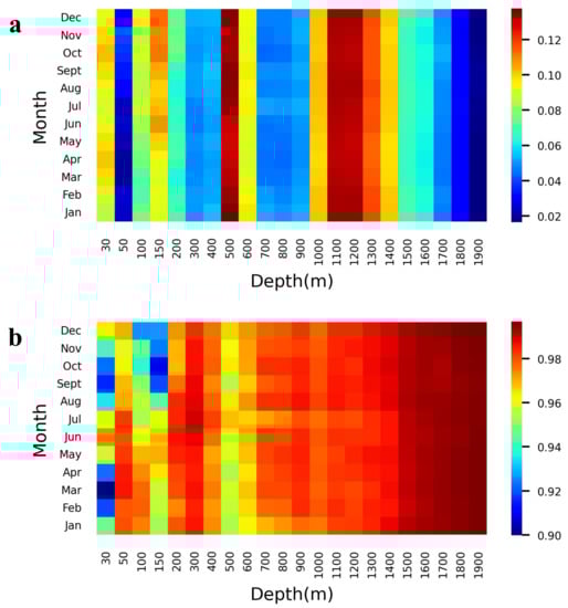 Model performance for SS estimation. (a) Normalized root mean square error (NRMSE), (b) coefficient of correlation (R) of the SS estimation at each depth level and in each month of 2018.