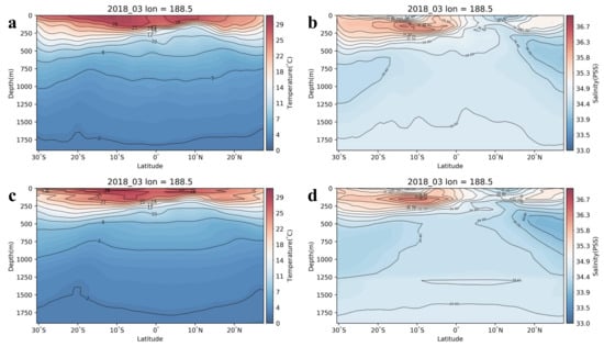 The meridianal vertical profiles of the ocean subsurface thermohaline in March 2018 at the longitude of 188.5° for (a) Argo ST, (b) Argo SS, (c) ConvLSTM-inversed ST, and (d) ConvLSTM-inversed SS.
