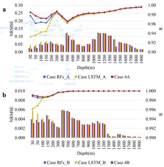 The NRMSE (left, bar) and R (right line) of inversion results at different depths by ConvLSTM models in different cases: (a) ST, (b) SS.