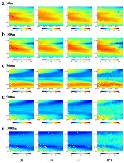 ST spatial distribution of (i) RFs, (ii) LSTM, (iii) ConvLSTM, and (iv) Argo gridded at (a) 50 m, (b) 100 m, (c) 300 m, (d) 500 m, and (e) 1000 m in March 2018.