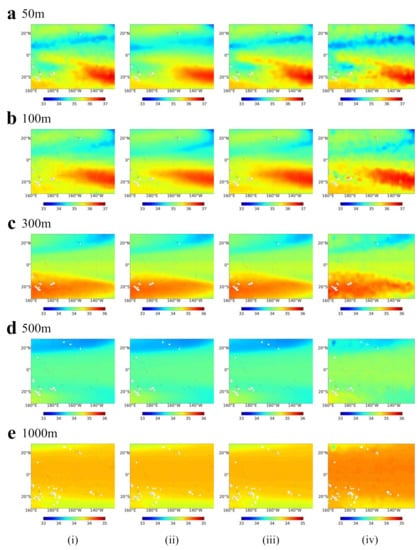 SS spatial distribution of (i) RFs, (ii) LSTM, (iii) ConvLSTM, and (iv) Argo gridded at (a) 50 m, (b) 100 m, (c) 300 m, (d) 500 m, and (e) 1000 m in March 2018.