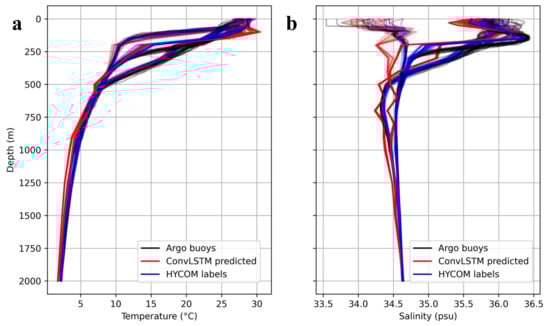 To study the vertical profiles in the region, we randomly selected some Argo buoys to compare with the model effects. Figure 13 shows the vertical profiles of Argo ST/SS (black line) and the ST/SS profiles predicted by ConvLSTM (red line), as well as the labeled values of the HYCOM product (blue line). It can be seen that the predicted values of ConvLSTM are closest to the HYCOM-labeled values in the temperature experiments because the model is trained with the HYCOM labels. The model inversion results are also very similar to the Argo buoy values, which demonstrates the inversion potential of the ConvLSTM model. In the salinity comparison experiments, the model inversions appear significantly different from the Argo and HYCOM true values from 0 to 300 m, but the overall trend is similar below 300 m. The actual error is only about 0.5 PSU because of the high resolution of the coordinate axes of the salinity map. In the temperature and salinity experiments, the label value of HYCOM is relatively consistent with the data of Argo buoys, which also proves the correctness of our data selection for the daily degree experiments. Although there is some error between HYCOM data and Argo buoys, the ConvLSTM model can learn the spatio-temporal correlation between the ocean surface and subsurface fields and achieve inversions similar to the hindcast data and the actual observations.