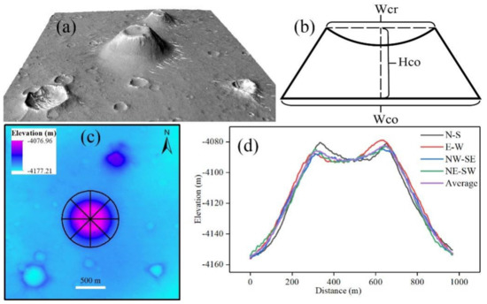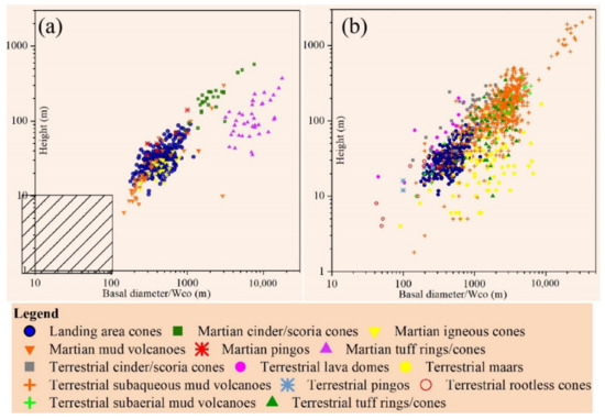 - Gilichinsky, M.; Demidov, N.; Rivkina, E.; Gilichinsky, M.; Demidov, N.; Rivkina, E. Morphometry of Volcanic Cones on Mars in Perspective of Astrobiological Research. IJAsB 2015, 14, 537–545. [Google Scholar] [CrossRef]