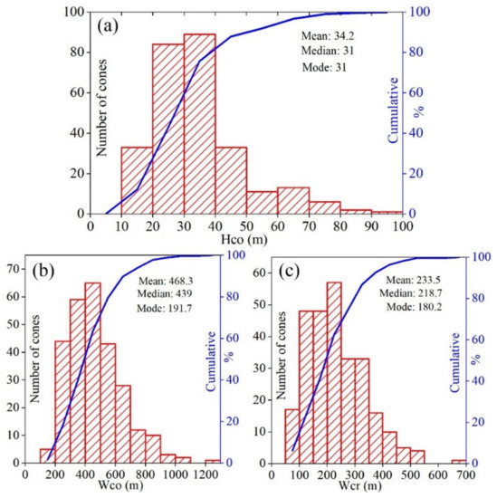 | Cinder/scoria cones | 28 | 75–573 (217.75) | 928–7500 (2347) | 0.0318–0.1432 (0.097) |