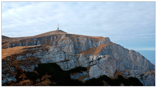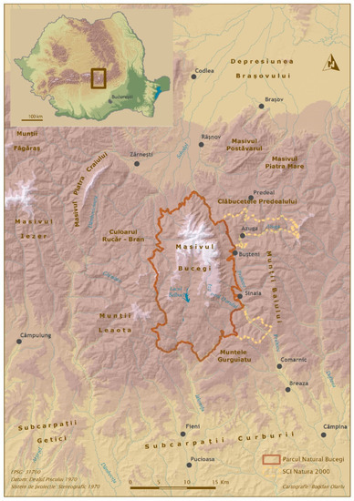 - PNB. Parcul Natural Bucegi—Plan de Management; Regia Națională a Pădurilor—Romsliva: Bucharest, Romania, 2018. [Google Scholar]