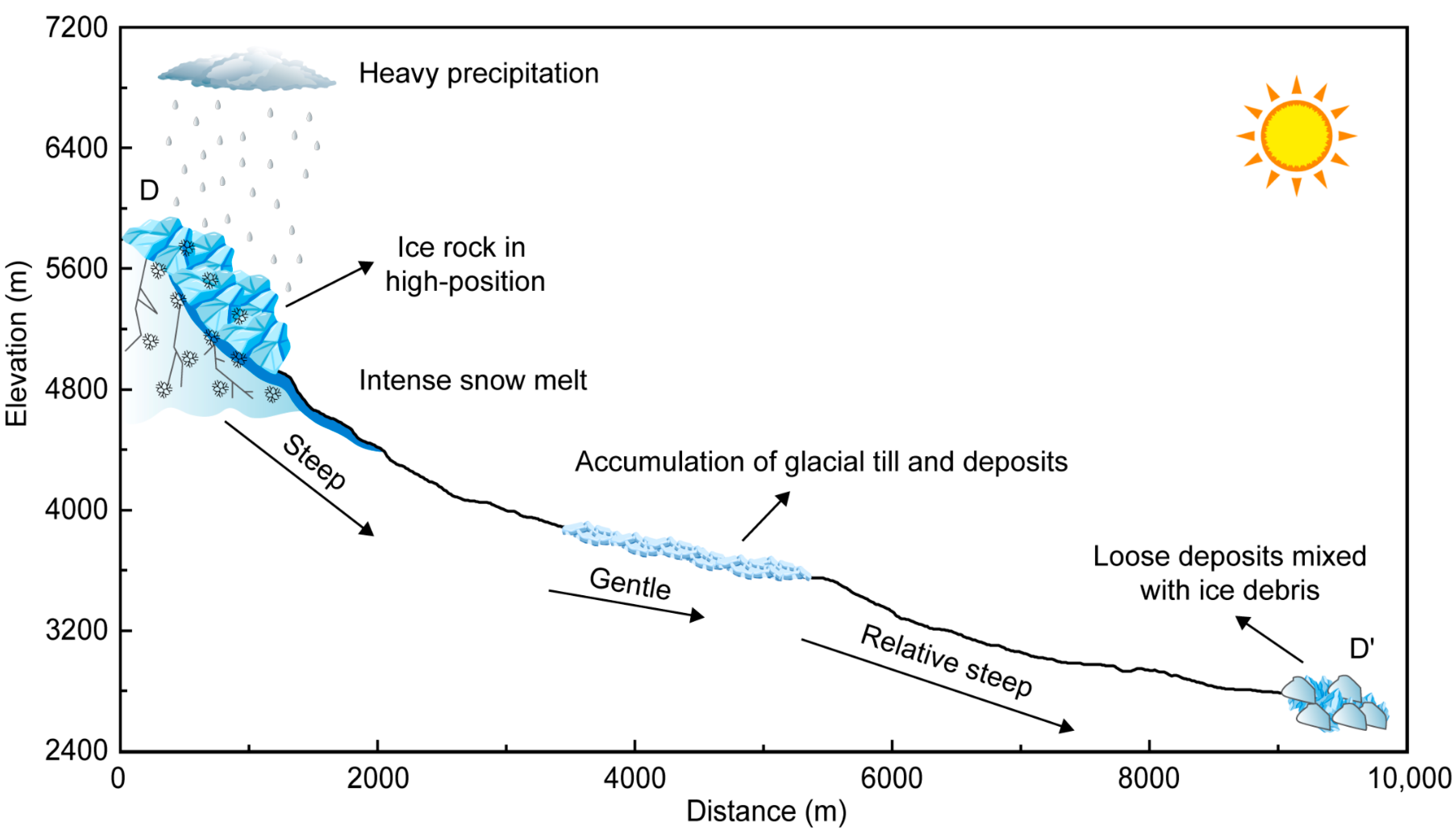 - Deng, M.; Chen, N.; Liu, M. Meteorological factors driving glacial till variation and the associated periglacial debris flows in Tianmo Valley, south-eastern Tibetan Plateau. Nat. Hazards Earth Syst. Sci. 2017, 17, 345–356. [Google Scholar] [CrossRef] [Green Version]