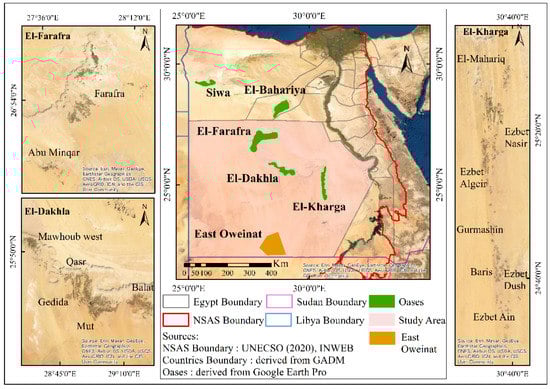 As one of the essential elements in the hydrological cycle in the Egyptian Western Desert, the Nubian Sandstone Aquifer System (NSAS) is a thick permeable sandstone formation located under the eastern end of the Sahara Desert, which extends across Egypt, Sudan, Chad, and Libya in northeastern Africa [], occupying about 2 × 106 km2.
