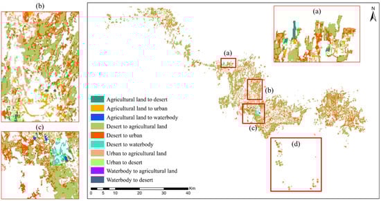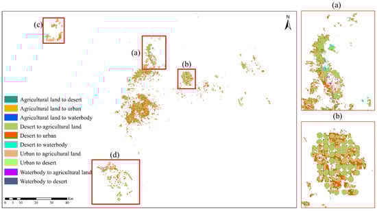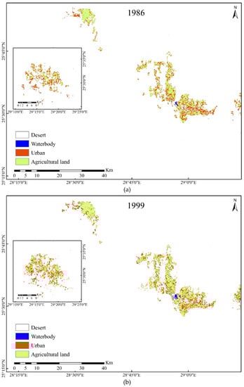 Figure 6a shows the changes in LULC types in Dakhla Oasis. The observation of changes over the entire study area demonstrated that changes in agricultural land, urban land, and water bodies were all apparent over a period of 35 years. Each class showed an overall trend of growth from 1986 to 2021 (Figure S1). The overall trends in the agricultural land changes (increase) in Dakhla Oasis were the same as those in urban area changes. However, in the short term, opposite trends in agricultural land and urban area changes were seen (Figure 6a), since the definition of urban area zoning includes both human-made non-agricultural land and fallow and abandoned cultivated lands (Table 3). Spectral characteristics show the fallow and abandoned agricultural lands as urban areas. Therefore, the periodic downward trends in the area of agricultural land are likely a reflection of changes in the agricultural land use (i.e., unused or in preparation) rather than an actual decrease in their area.