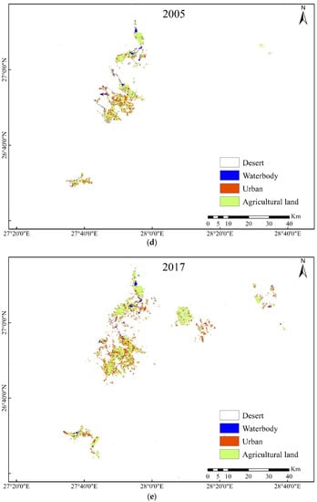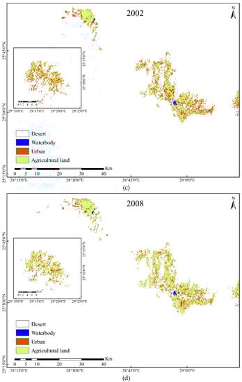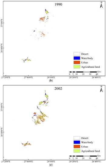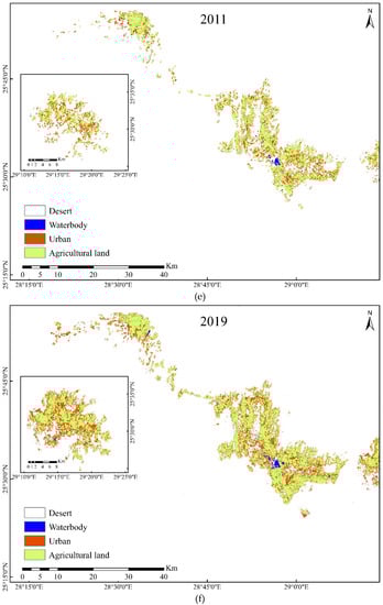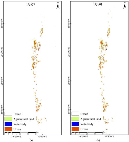 LULC maps of the three oases in New Valley were established every three years. We summarize the six periods with apparent changes over the 35 years in each oasis in Figure 3, Figure 4 and Figure 5, and the remaining images are shown in the Supplementary Materials.