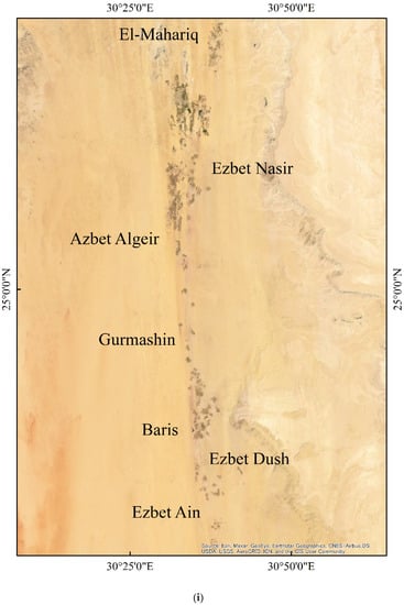 The LULC distribution of Dakhla Oasis consisted of three separate areas—namely, Mawhoub West in the northwest; Qasr, Gedida, and Mut in the southeast; and Balat in the east (Figure 3i).