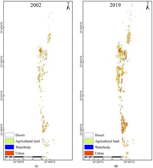The 30 m resolution land cover map from 2002 to 2019 and the 10 m resolution land cover map for 2021 were created using the OBIA method, which involved sorting the classes into urban area, agricultural land, desert, and water bodies, as shown in Table 3 and Figure 3, Figure 4 and Figure 5. Bare land samples could not be filtered out by the sampling method applied because of the similarity between the spectra of bare land and urban area. Accordingly, bare land was not shown independently in the classification results.
