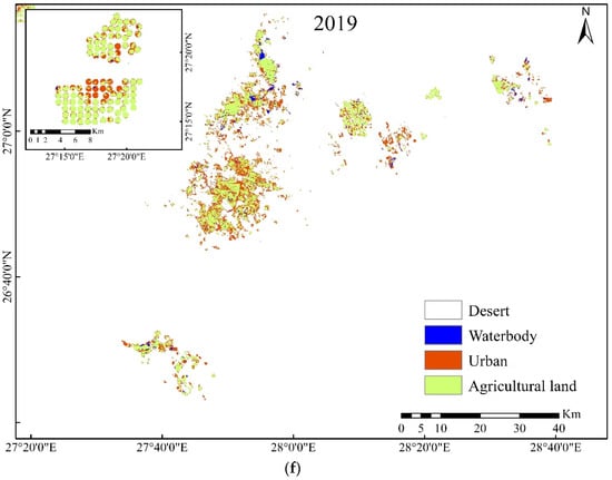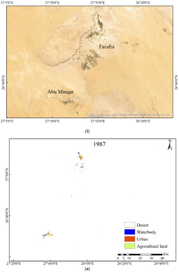 Land use and land cover classification maps of Farafra Oasis; (i) distribution of regions in Farafra Oasis, (a) 1987, (b) 1990, (c) 2002, (d) 2005, (e) 2017, and (f) 2019; refer to Supplementary Figure S3 for all maps from 1987 to 2021.