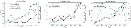 LULC development of the main classes of the three oases in New Valley from 1986 to 2021: (a) LULC development of main classes in Dakhla Oasis from 1986 to 2021; (b) LULC development of main classes in Kharga Oasis from 1987 to 2021; (c) LULC development of main classes in Farafra Oasis from 1986 to 2021.