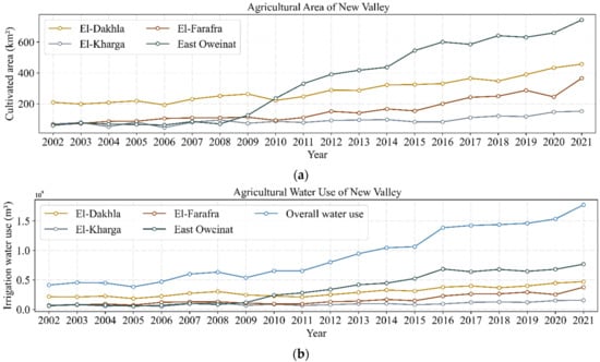 After revealing the changes in LULC, we attempted to quantify the primary water consumption pattern (i.e., irrigation for agricultural use) in order to estimate the effect of LULC on the water consumption of oases in the study area. The irrigation water per unit value was calculated based on the irrigation water used in the three agricultural seasons of Egypt (from 2002 to 2019); the total cropping area of Egypt (from 2002 to 2019) [W Egypt/A Egypt] was determined from the Egypt Statistical Yearbook (Table 2).