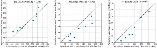 All Landsat images used for LULC classification were geometrically corrected using the ENVI software. The reference system used was the UTM map projection Zone 35 North (Dakhla Oasis and Farafra Oasis) and Zone 36 North (Kharga Oasis) from the WGS 1984 datum. Sentinel-2 Level-2A provided orthorectified atmospherically corrected surface reflectance data. Clouds seldom obscure satellite images taken in the Western Desert of Egypt []. The chosen dates for each image fell in the late part of the growing season.