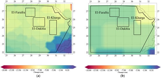 As the primary groundwater-consuming sector in New Valley since the 1990s, agriculture was expanded through the exploitation of water resources from the NSAS in response to the expected future population growth. However, the large-scale development of oasis agriculture is expected to lower the groundwater table around the oases []. As one of the largest and most extensively investigated fossil water aquifer systems in the world, the average depletion rate across the NSAS in Egypt is estimated to have been −3.38 ± 0.21 mm/yr (−2.23 ± 0.14 km3/yr) from April 2002 to June 2016 [].