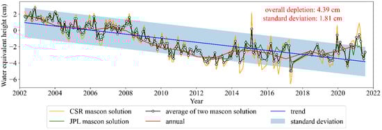 In this study, two mascon solutions of GRACE from the Jet Propulsion Laboratory (JPL) and Center for Space Research (CSR) are operated owing to the fact that mascon solutions generally show lower levels of uncertainty compared to most SH solutions []. However, mascon solutions should only be utilized for basin-level time-series analyses at dimensions broader than 200,000 km2.