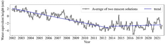 Mask across New Valley’s area was applied to the two types of GRACE mascon solution. These GRACE mascon solutions were averaged over New Valley’s area. The arithmetic mean of the two mascon solutions was applied to extract the groundwater consumption by multiplying the New Valley’s area, as the average was found to reduce the noise in the gravity field solutions within the available scatter of the solutions []. Change point was analyzed on the ΔGWS time series.