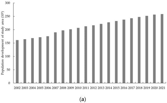 The three classes (agricultural, urban, and surface water areas) all showed an overall trend of increase over the study period (Figure 6c); this trend of increase is particularly apparent for agriculture, and urban area is a close second. Agricultural land and urban area divisions show an opposite trend of change during the period 1999–2005, then dis-played a consistent trend of increase after 2005 before decreasing between 2019 and 2021.